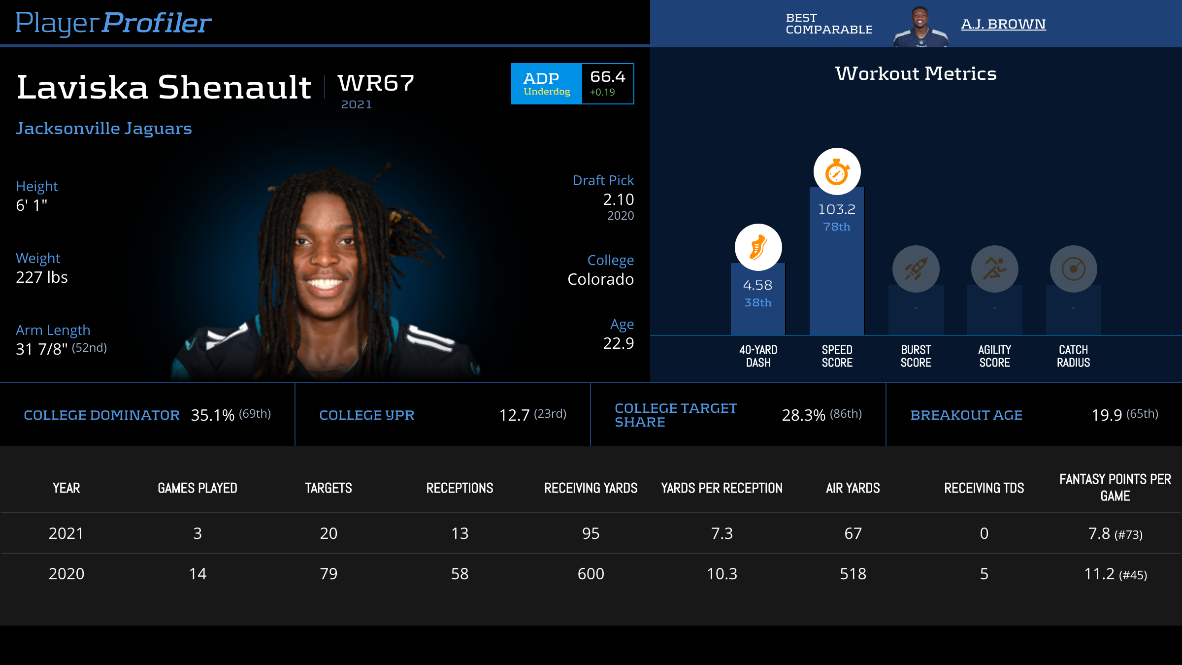 The Jaguars are breaking Laviska Shenault. I don’t think he stinks…yet. He’s been horribly misused, limited to a 4.3 (No. 95) Average Target Distance, 83.1-percent (No. 44) Route Participation, and a -26.8-percent (No. 121) Target Premium. Until proven otherwise, Shenault belongs on the bench (but is a sneaky Hail Mary in DFS).