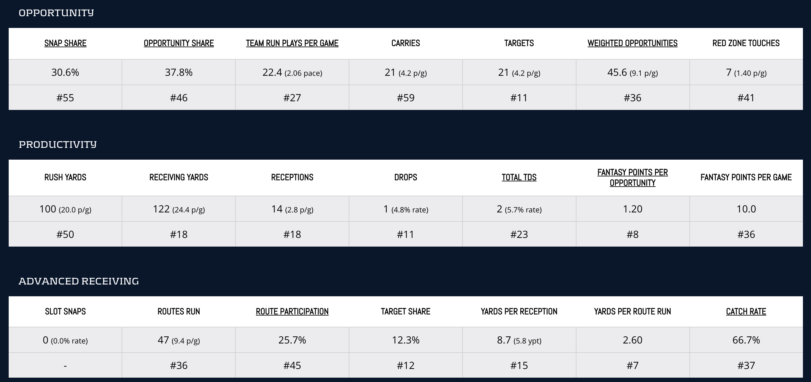 If you’re looking for a consolidated Target Share, this is not your team. Mike Evans leads the group with a 20.5-percent (No. 40) Target Share. Despite lower target volume, he has been consistent. He’s scoring 18.5 (No. 11) Fantasy Points Per Game, and his 15.8-percent (No. 26) Hog Rate shows solid per-snap usage. Start Evans this week, even against No. 10-ranked cornerback Darius Slay.